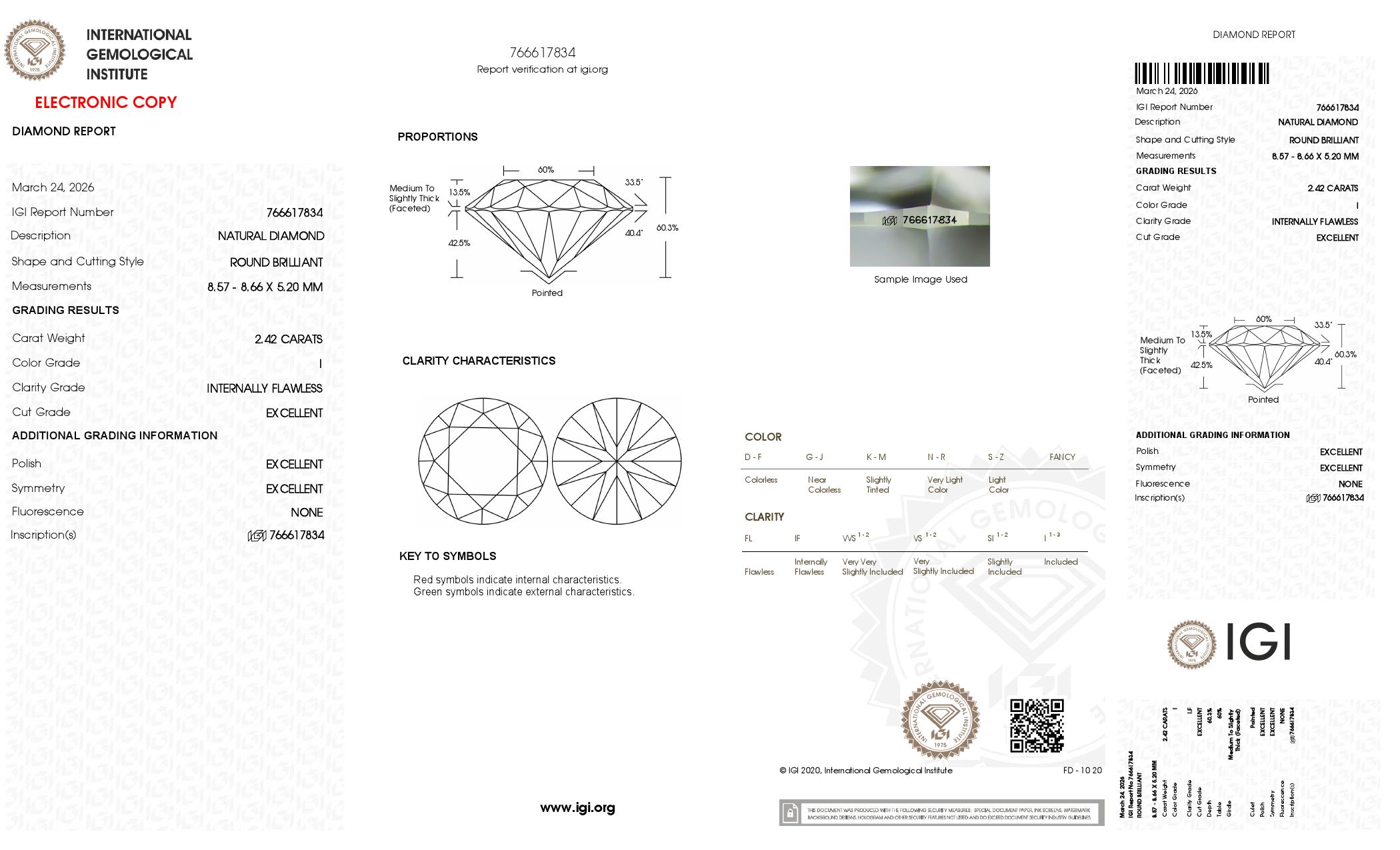 The IGI certificate (#766617834) is an independent grading report that verifies this diamond's carat weight, color, clarity, cut, and other physical properties. It serves as a trusted third-party guarantee of the stone's quality. Always verify the certificate number on the issuing lab's website before purchasing.