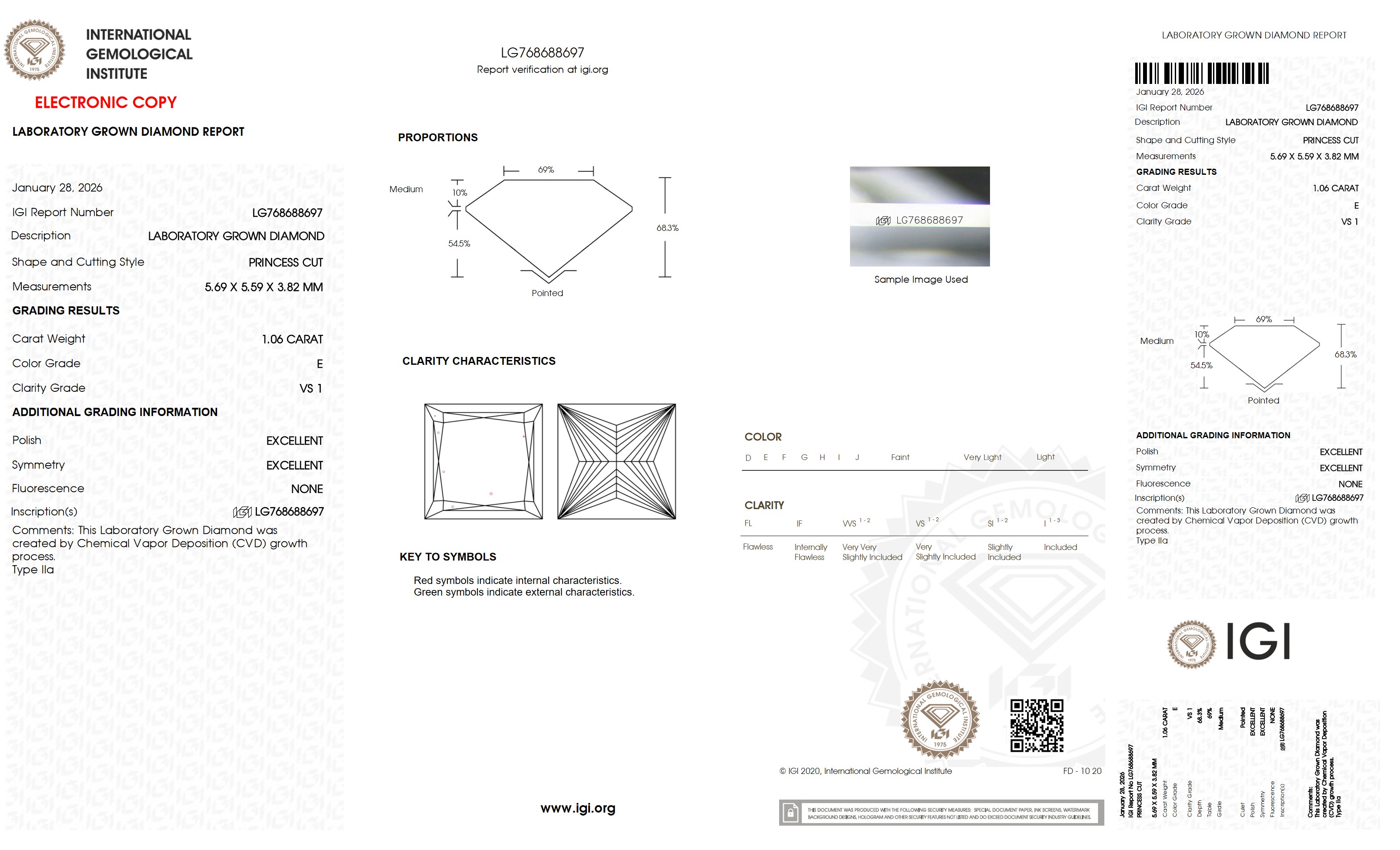The IGI certificate (#768688697) is an independent grading report that verifies this diamond's carat weight, color, clarity, cut, and other physical properties. It serves as a trusted third-party guarantee of the stone's quality. Always verify the certificate number on the issuing lab's website before purchasing.