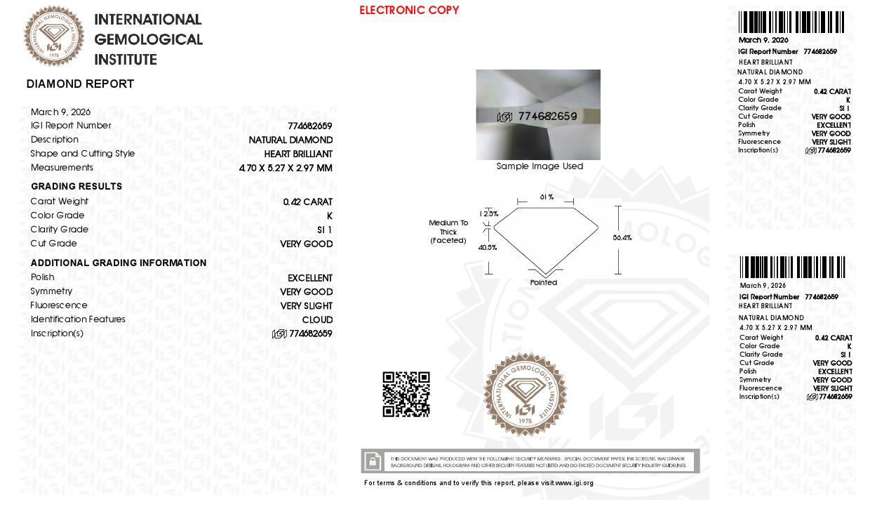 The IGI certificate (#774682659) is an independent grading report that verifies this diamond's carat weight, color, clarity, cut, and other physical properties. It serves as a trusted third-party guarantee of the stone's quality. Always verify the certificate number on the issuing lab's website before purchasing.