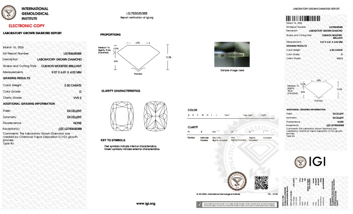 This 2.3 carat cushion cut lab grown diamond (IGI #783635388) is currently listed at 3 retailers. Prices across stores range from $1,250 to $5,430, a spread of $4,180 (334%). The same certified stone can vary in price depending on a retailer's margin, promotions, and included services comparing offers side by side is the fastest way to find the best deal.